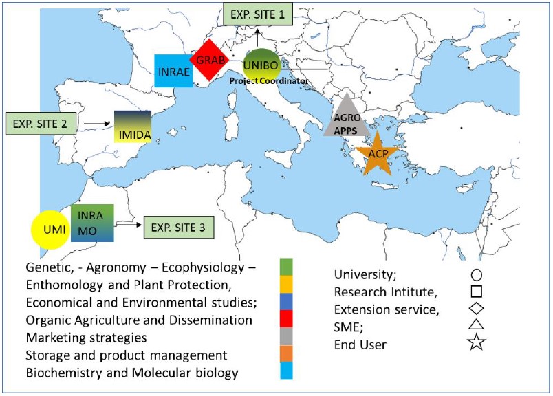 The range of latitudes covered by DREAM partners is very important for the project success as it allow to test the new agroecosystem in different environmental conditions, thus widening the potential impact of the project. Most importantly the Team, covers a wide range of multidisciplinary expertise such as agronomy and ecophysiology (UNIBO and INRA Mo,); plant genetics (UMI, UNIBO), plant metabolism and molecular biology (INRAE), plant health and protection (UMI, IMIDA, UNIBO), economic and environmental assessment (IMIDA), marketing strategies in agriculture (AGROAPPS); sustainable crop management and organic farming (GRAB), ecosystem biodiversity assessment (UNIBO, IMIDA).